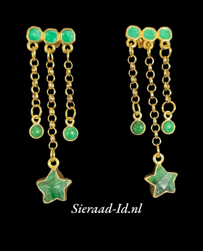 Schattige oorhangers, met Malachiet (groen) sterretjes en bolletjes en Onyx (zwart) sterretjes en bolletjes